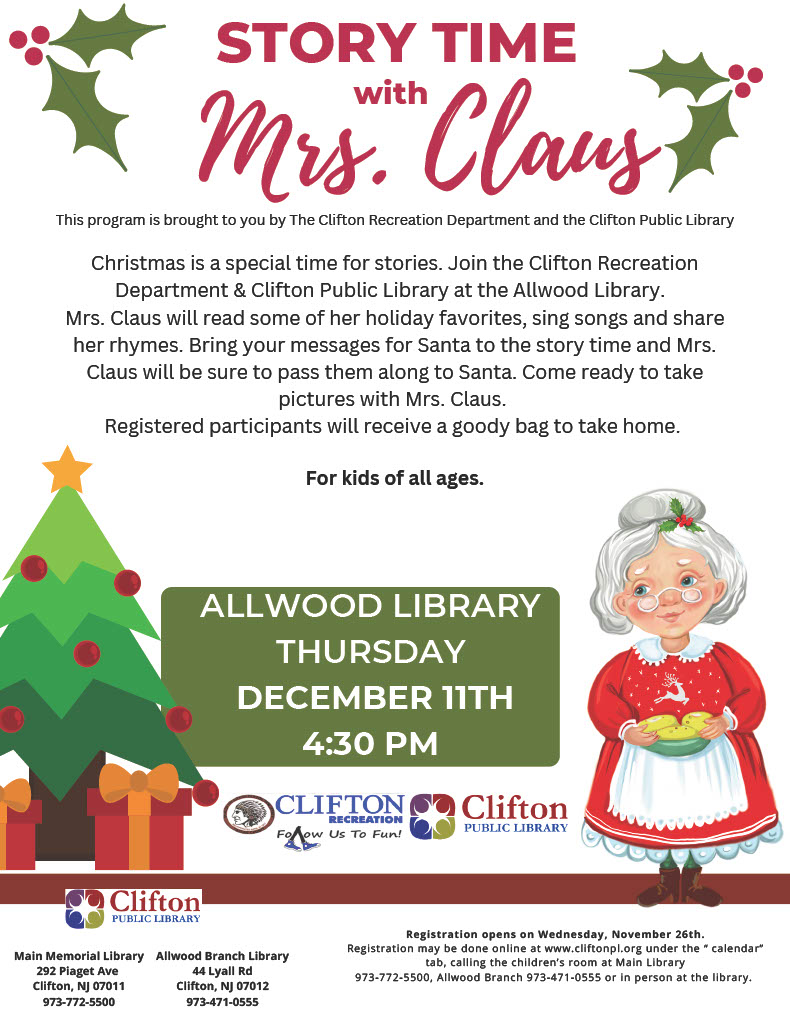 Christmas is a special time for stories. Join the Clifton Recreation Department & Clifton Public Library on Thursday, December 11th beginning 4:30 p.m. at the Allwood Library. Mrs. Claus will read some of her holiday favorites, sing songs, and share her rhymes. Bring your messages for Santa to the story time and Mrs. Claus will be sure to pass them along to Santa. Come ready to take pictures with Mrs. Claus. Registered participants will receive a goody bag to take home. All registered children must be accompanied by one (1) parent/guardian to the program. Please do not bring extra family members to the program due to limited room capacity. The program is FREE but pre-registration is required. Registration opens November 26th and may be done through the Clifton Public Library website www.cliftonpl.org. Click on the "calendar" tab to register, by calling the children's room at the Main Library (973) 772-5500 or the Allwood Branch at (973) 471-0555, or in person at the library.